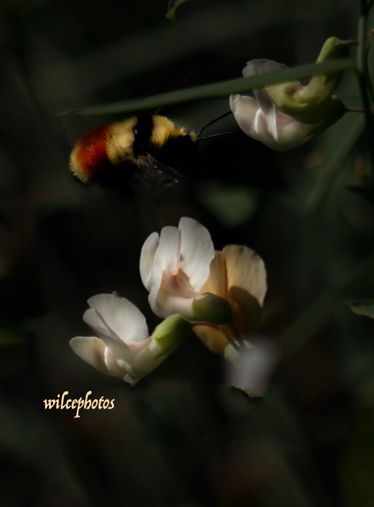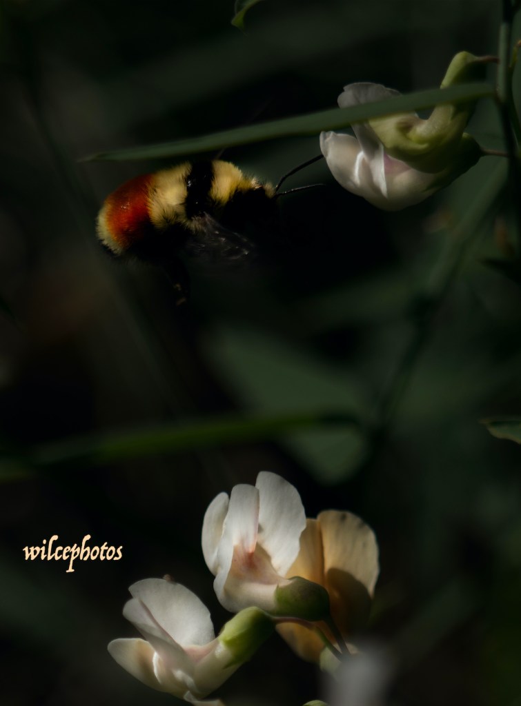 Here are three versions of a photograph of a tricolored (Hunt’s?) bumblebee hovering by white vetch flowers. (Vetches are in the pea family). This post particularly draws your attention to the middle (2nd) of the three versions of the original, illustrating involve a Photoshop tool you might want to learn (contact me if interested messaging me on whatsapp, 602-456-2389)