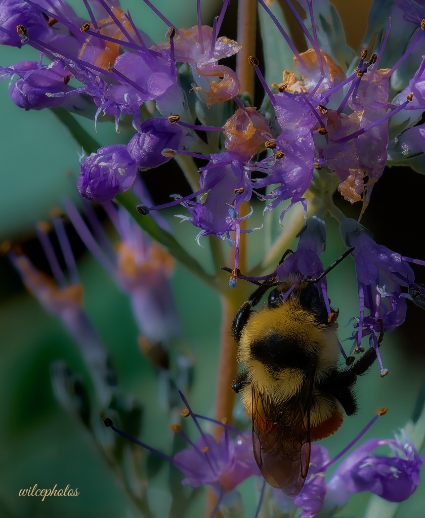 This tri-colored bumblebee was doing its pollinator thing on a blue knight flower in 2022 with the OM-1 camera and a long lens (300mm prime) at ISO 2000 1/2500s f/9.