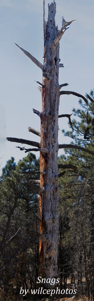 Snags are important in forest ecology. This photograph illustrates that very well. Snags are like great big apartment buildings for critters– especially insects and birds. Little birds like nuthatches peck out holes in snags as nests!