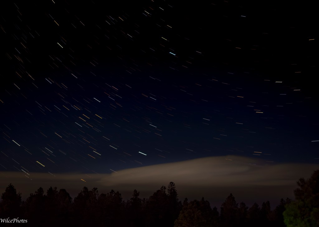 This is a digital download of a long-exposure photograph capturing the movement of the stars and cloud over the sacred San Francisco Peaks. I shot it today (1/4/24) on a tripod using a 40-150mm (12-40mm) lens on an OM-D E-M1 Mark II Olympus mirrorless camera.