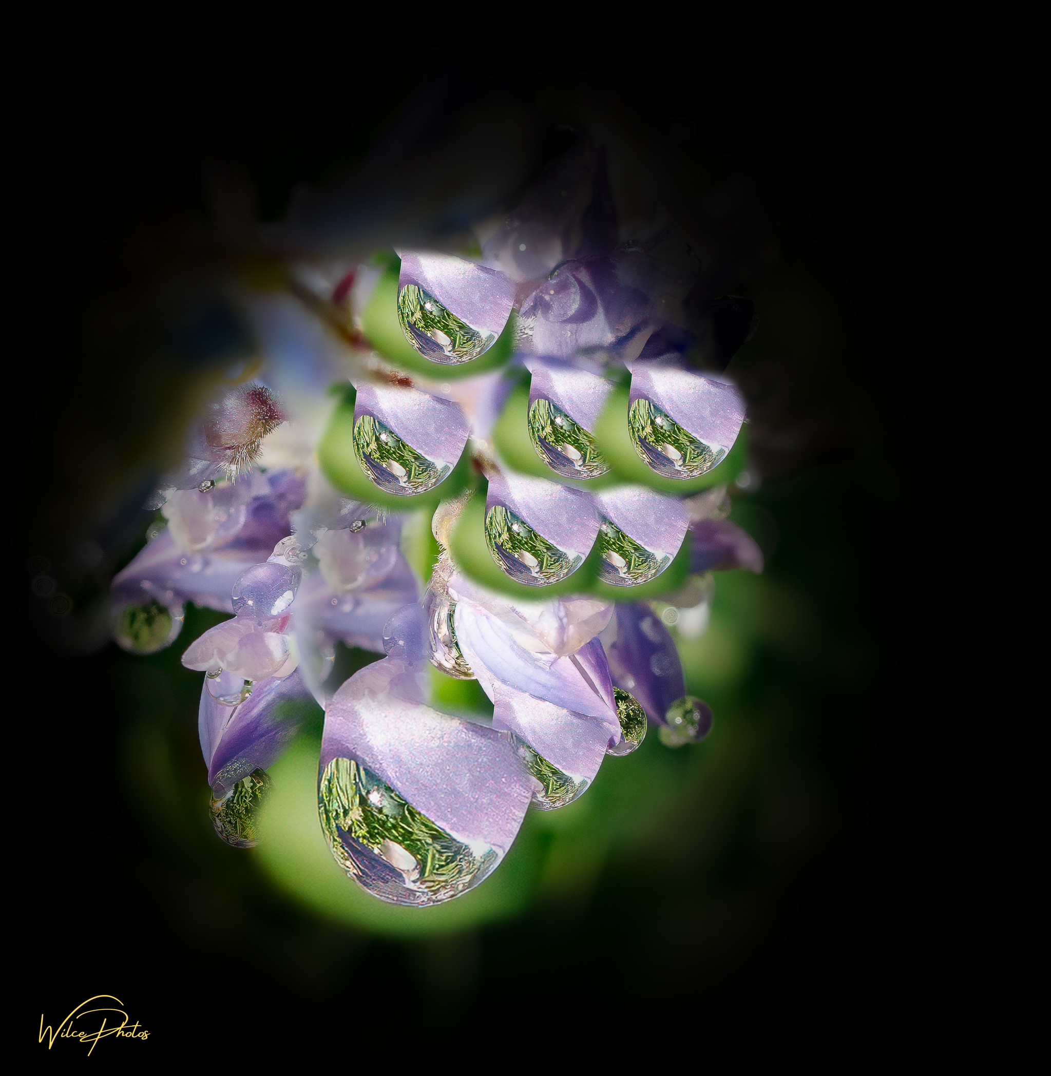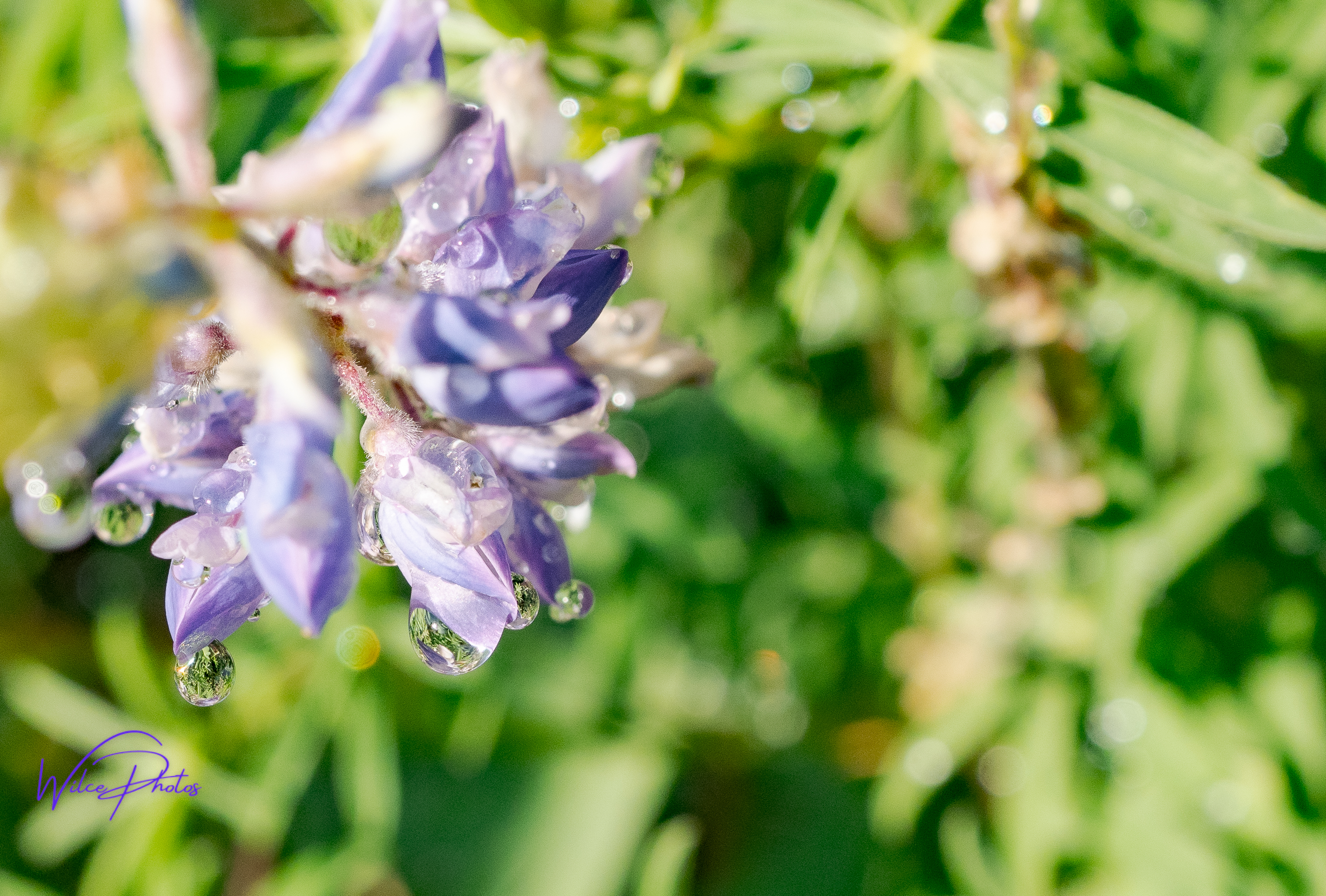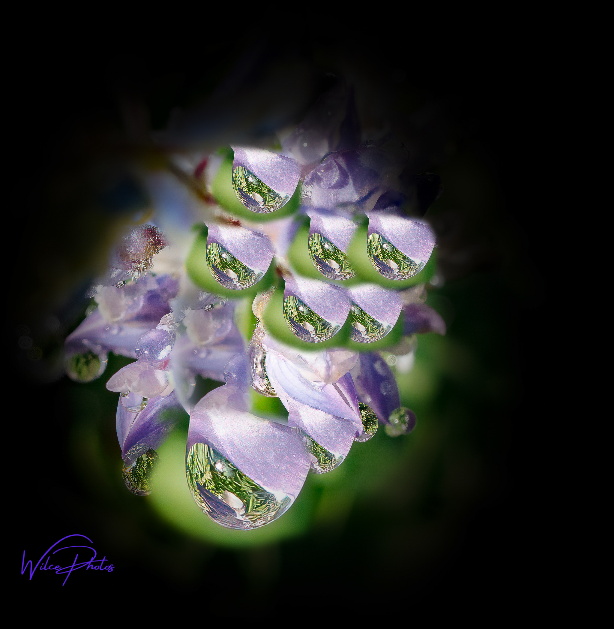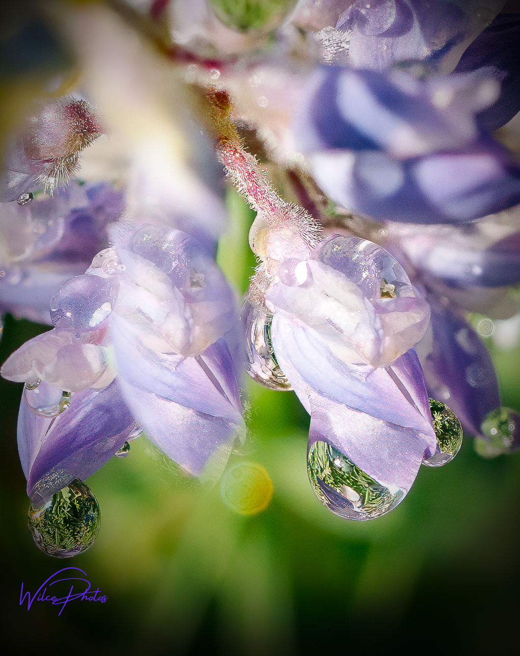 This morning (6/13/24) in Flagstaff Arizona, the sprinkler system left water droplets on our lupine flowers (among others). I took quite a few photos of their beauty. Here are five versions of those efforts from the “original” through four edits.