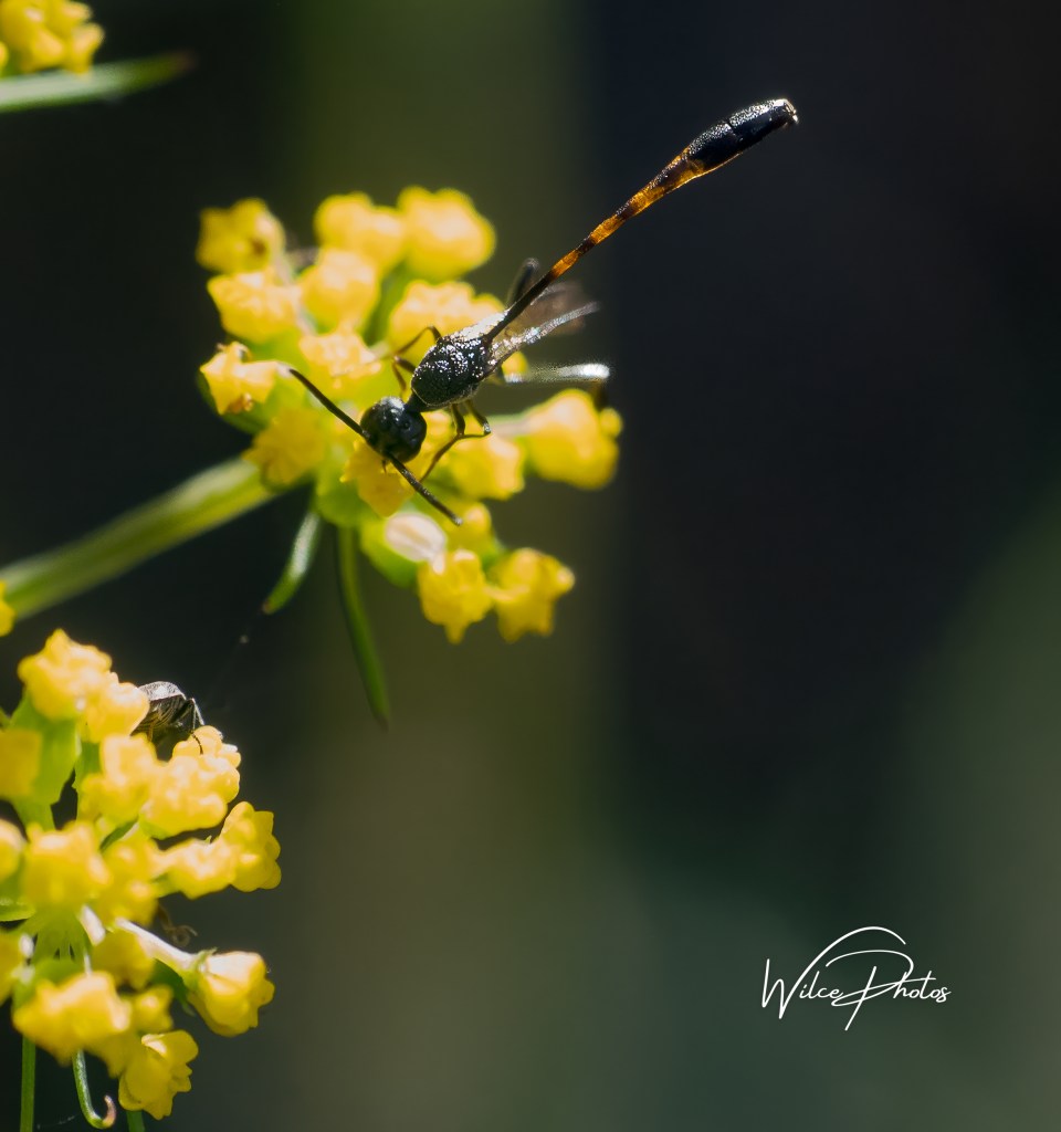 My latest macro phot: This wasp (one of the thread-waisted, probably) is roughly 1 cm long! So tiny, yet I was able to shoot this photograph hand held, with the Raynox 2.5x closeup filter on an Olympus 12-40mm F2.8, ISO 1600 1/800s f5.0, focal distance 40mm.